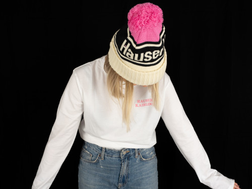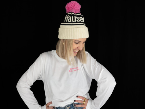 Diese moderne Winterhaube kombiniert sportliches Design mit trendigen Farbakzenten. Das kontrastreiche Schwarz-Weiß-Muster und der leuchtend pinke Bommel machen sie zu einem echten Blickfang. Der breite Umschlagrand sorgt für einen angenehmen Sitz und zusätzliche Wärme. Der „HAUSER KAIBLING“-Schriftzug verleiht der Haube einen unverwechselbaren Look – ideal für alle, die den Berg lieben.