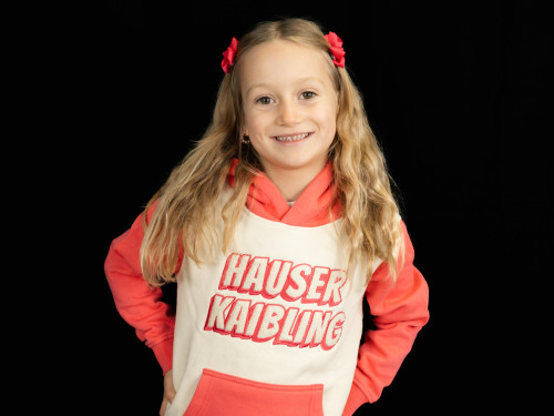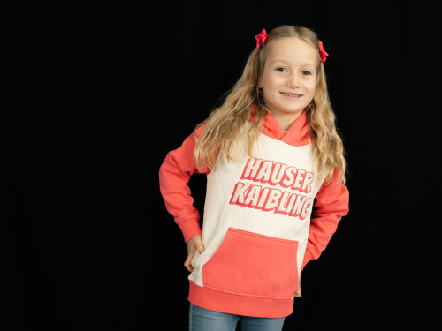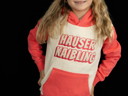 Dieser stylische Kinder Hoodie kombiniert kräftige Pinktöne mit einer cremefarbenen Vorderseite und sorgt so für einen modernen, fröhlichen Look. Der „HAUSER KAIBLING“-Frontprint macht den Hoodie zum echten Hingucker.