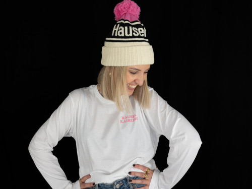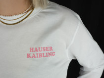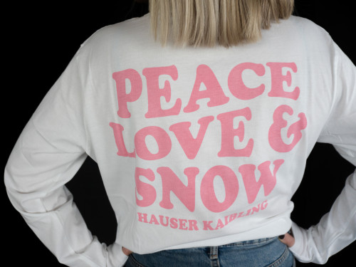 Dieses trendige Longsleeve kombiniert minimalistisches Design vorne mit einem auffälligen Statement auf der Rückseite. Auf der Brust befindet sich ein dezenter „Hauser Kaibling“-Print in Rosa, während der große Backprint „PEACE LOVE & SNOW – HAUSER KAIBLING“ echtes Winter- und Bergfeeling ausstrahlt.
